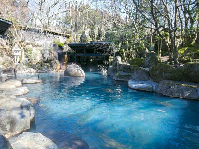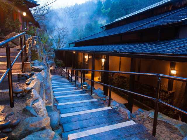 屏風岩露天風呂をはじめ、木と岩を巧みに調和させた「切石露天風呂」「観音露天風呂」など個性的な風呂がそろう。食事つきプランでは、季節の料理を味わうことができる。