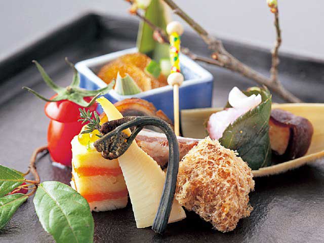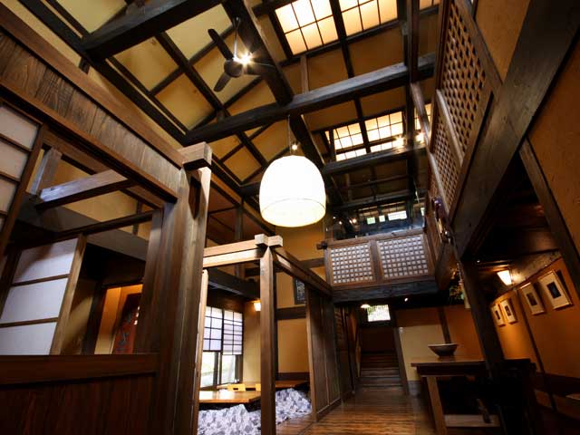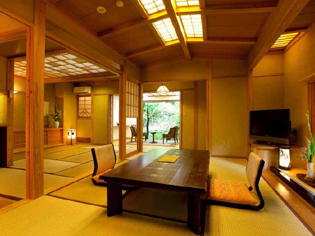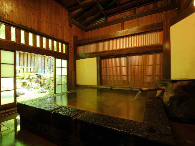 田の原川に向かって開放した庭園ふうの露天風呂が好評。夕食は古い民家を移築した食事処で。広い敷地に連なる客室は、離れ5棟6室と母屋の和室が2室。全室趣の異なる風呂がつく。