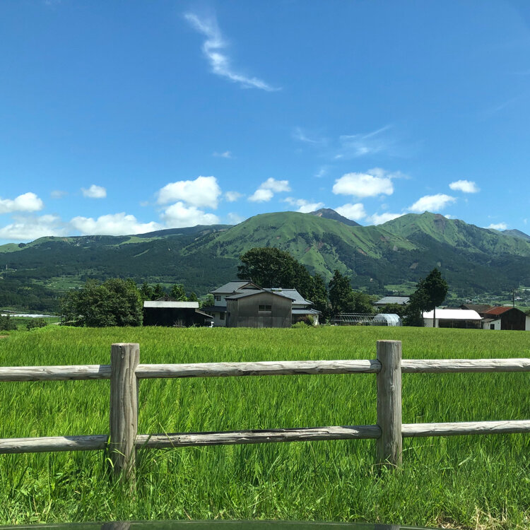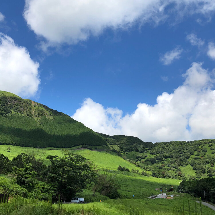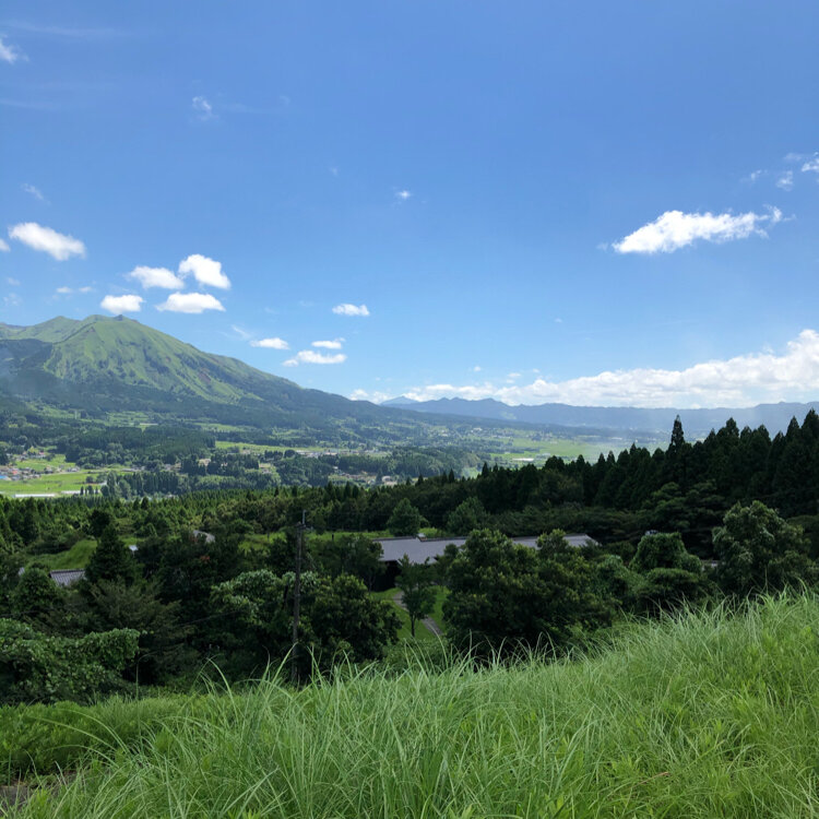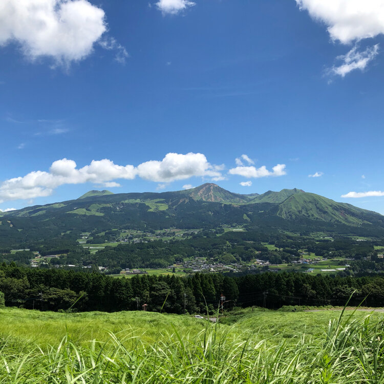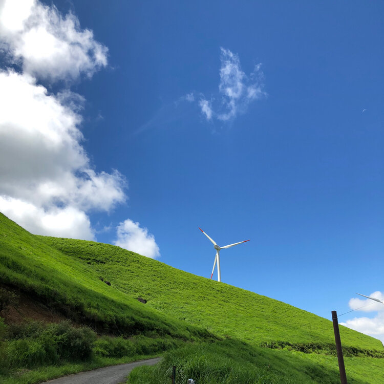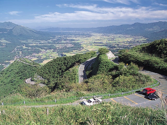 周辺の巨大な風車が目を引く、標高約700mに位置する展望所。眼下に南阿蘇谷や阿蘇五岳を眺める。夕日があたりを赤く染め、山並みに沈んでいく様子がひと際美しい。