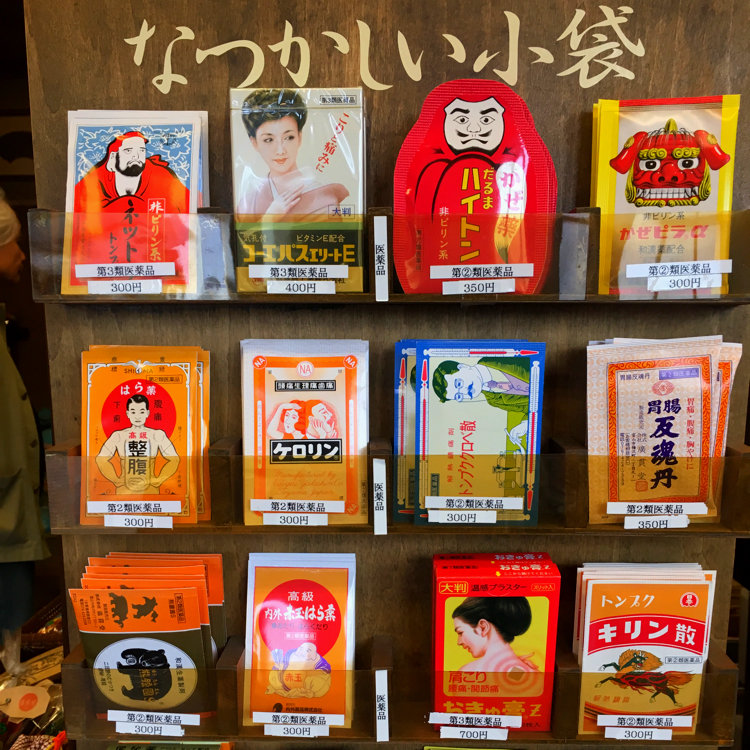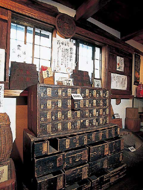 江戸時代から続く県下最古の薬局。明治20(1887)年の発売以来、万能薬として有名な日本丸の製造元。店舗の一部が博物館になっていて、昔の製薬道具やポスターを展示。