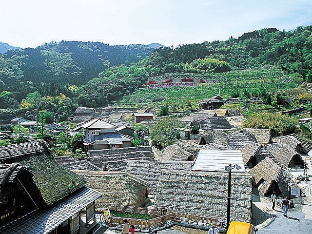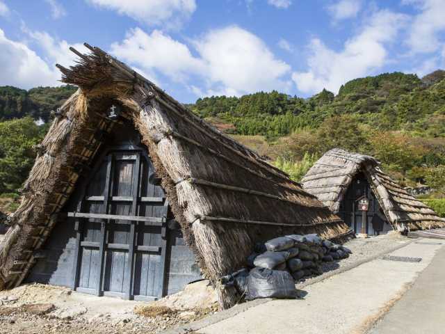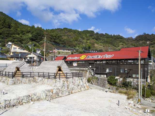 湯けむりが上がるワラ葺きの「湯の花小屋」が旅情を高める