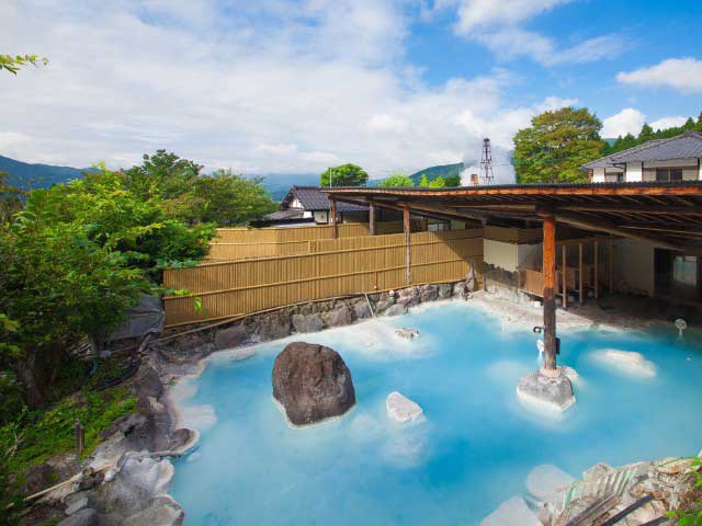 由布岳を望む5000坪の敷地に15棟の離れが点在。ブルーになる良質の温泉をもち、各棟の風呂のほかに、男女別の広々とした露天風呂がある。「温泉のある別宅」感覚で過ごすことができる。