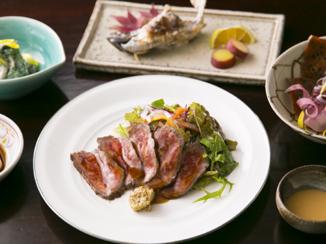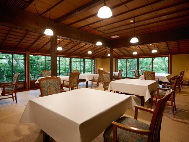 旅館「亀の井別荘」庭内にある食事処。季節の野菜や川魚、黒毛和牛など地元の食材を使った料理が味わえる。ランチ限定のステーキ膳やそば御膳もおすすめ。