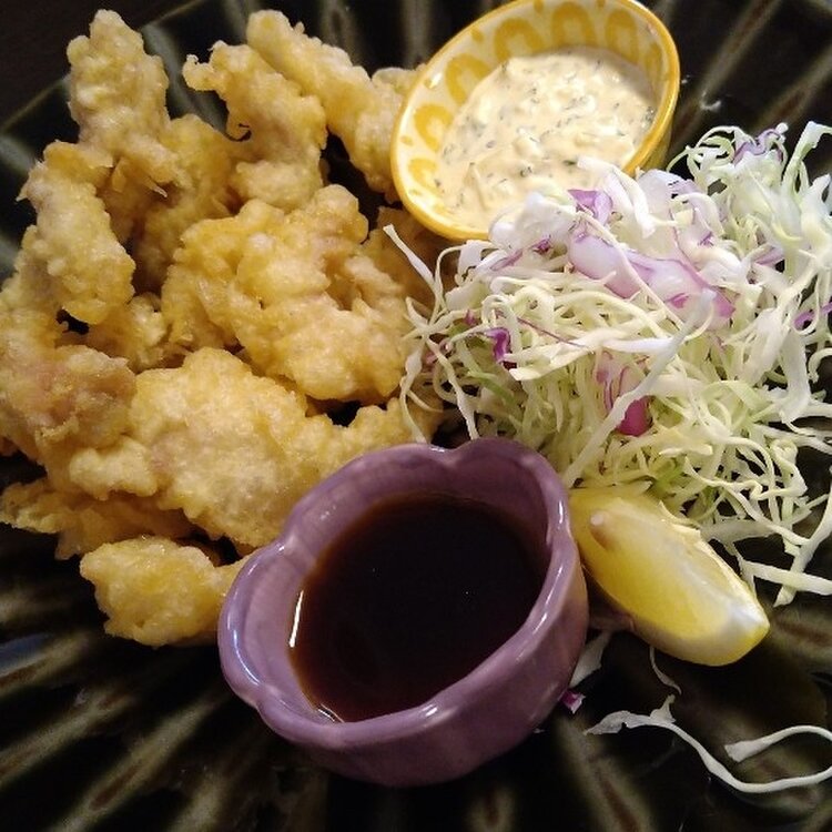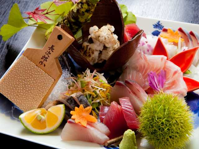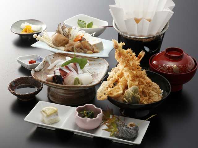 地元で評判の活魚料理の店。豊後アジ、豊後サバをはじめ季節に応じた旬の魚が味わえる。名物は四種の野菜と2尾のエビがのる天丼。
