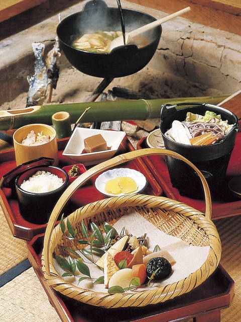 築260年の民家を移築した食事処。予約制で地元の産物を使った料理「蘇食物語」が味わえる。とうきび飯、野菜の煮しめ、古代黒米のうどんなどが並ぶ。