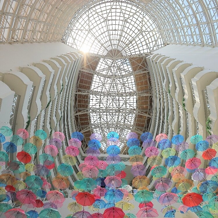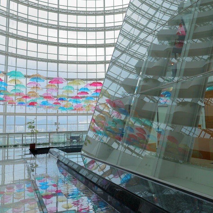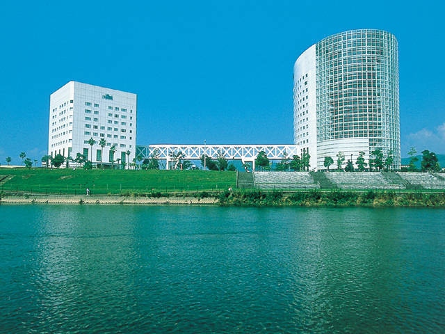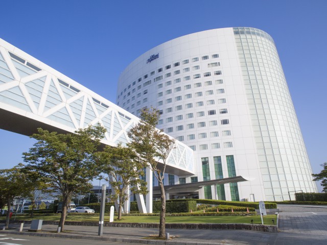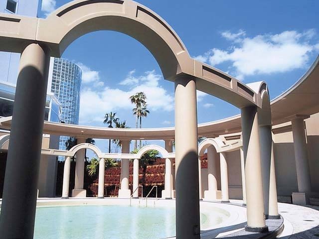 圧倒的な吹抜け空間は建築家、黒川紀章氏の設計。天然温泉やプールにジム、和・洋・ブッフェ各レストラン有