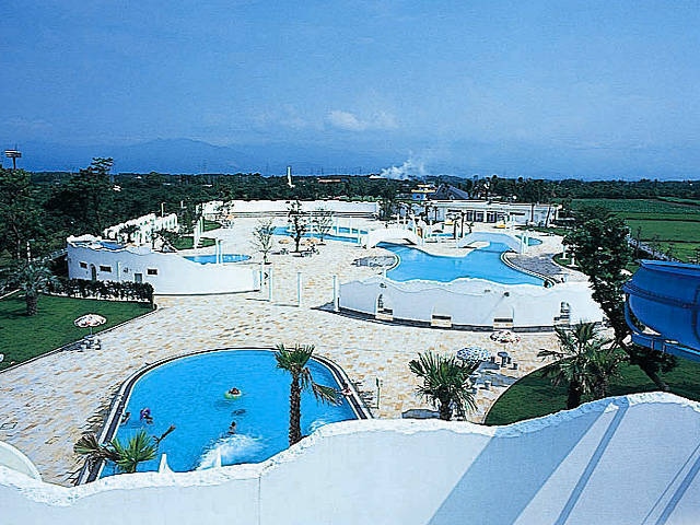 圧倒的な吹抜け空間は建築家、黒川紀章氏の設計。天然温泉やプールにジム、和・洋・ブッフェ各レストラン有
