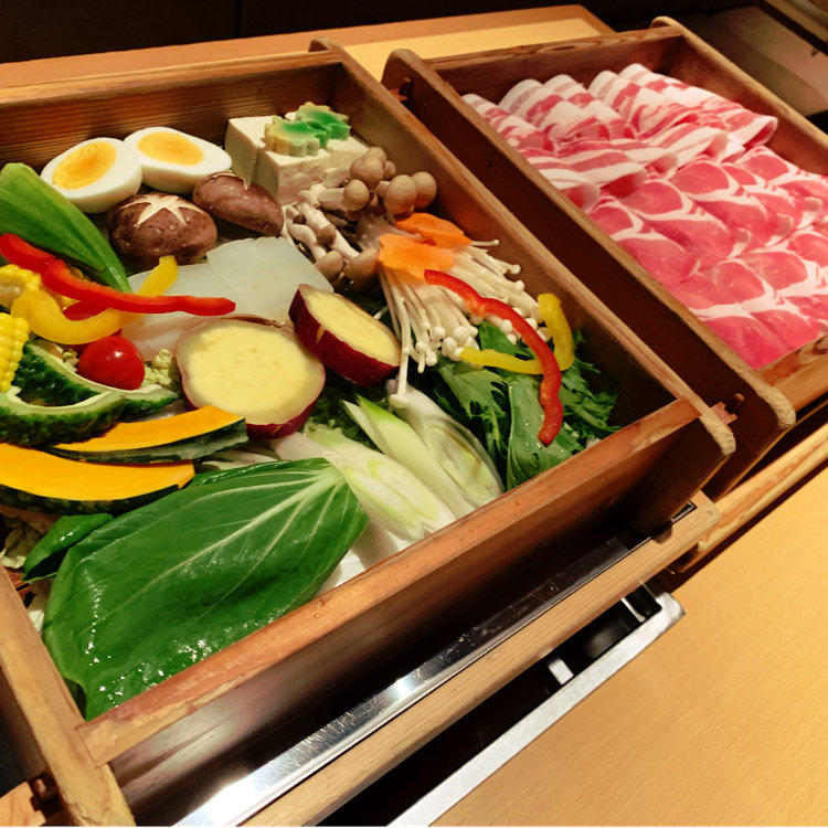 JA鹿児島県経済連の直営店。上段に鹿児島黒豚、下段に季節の野菜を敷いたせいろ蒸しは、素材の味を堪能することができる。黒豚、黒牛、黒さつま鶏が一度に味わえるコースもおすすめ。