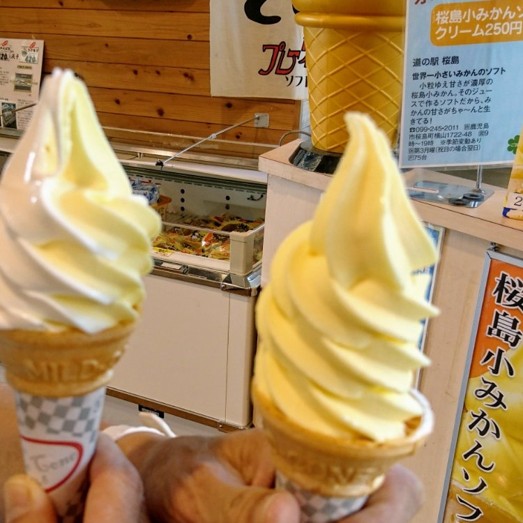 12月から1月に桜島でとれる特産品の桜島小みかん。その果汁が入ったソフトクリームはすっきりとした味で人気がある。ドレッシングやグラッセなどの小みかん製品も販売。