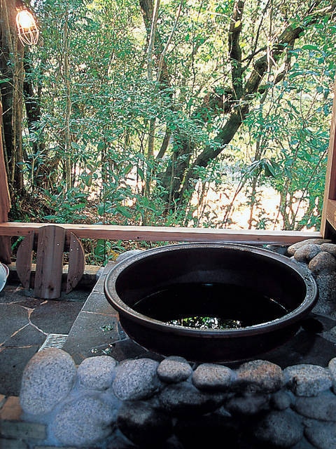 囲炉裏や屋久杉のくりぬき風呂が付く、和を基調としたコテージ。五右衛門風呂が川を見下ろすように設けられ、絶えず聞こえるせせらぎがなによりのぜいたく。屋久杉工芸のギャラリーを備えていて、宿内では屋久杉の箸作り体験ができる。