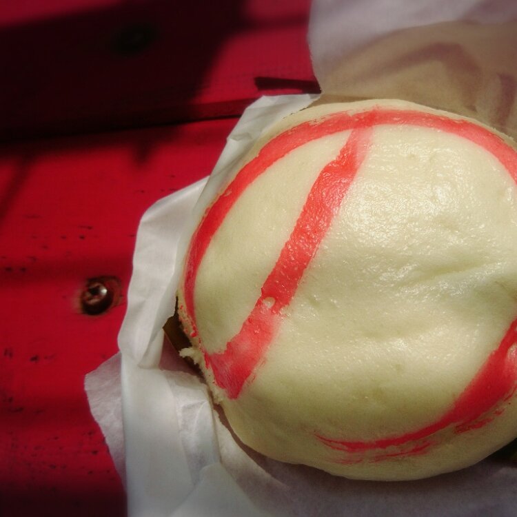 白くふっくらとした饅頭には、のしを意味する「の」の字が紅色で大きく書かれていて、見るからにおめでたい印象。中には餡がぎっしり詰まっていてボリューム満点。