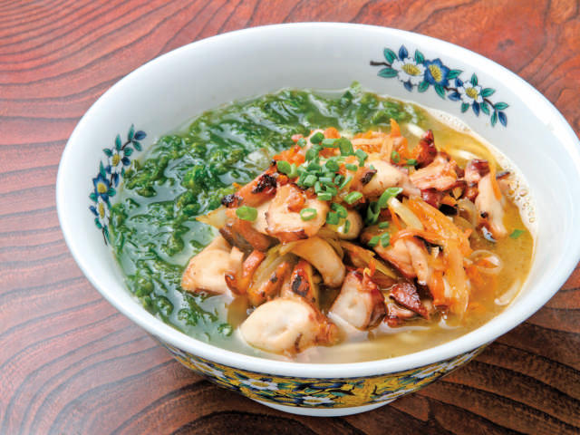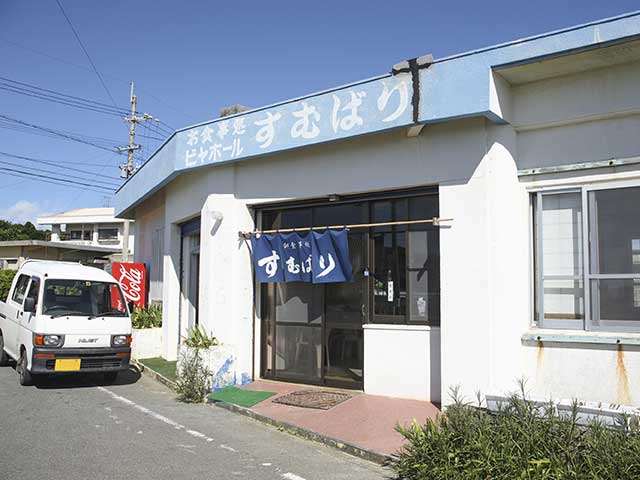 西平安名崎と池間大橋への分岐点にある食堂。「すむばりそば」をはじめ、地元漁港で水揚げされる新鮮なタコをふんだんに使ったオリジナルのタコ料理のメニューがずらりと並んでいる。