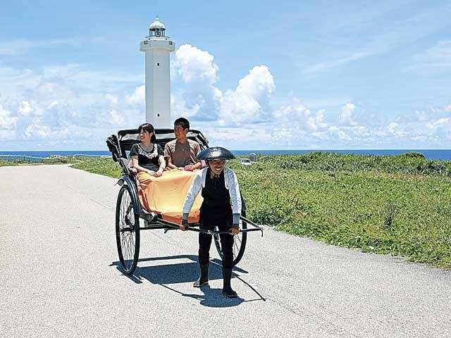 東平安名崎の駐車場から灯台までの往復約1kmを人力車で案内。歩くと長く感じる道のりを、「人力マン」こと佐々木祐一さんの岬の植物説明、地形の解説や民謡を交えたガイドで満喫しよう。