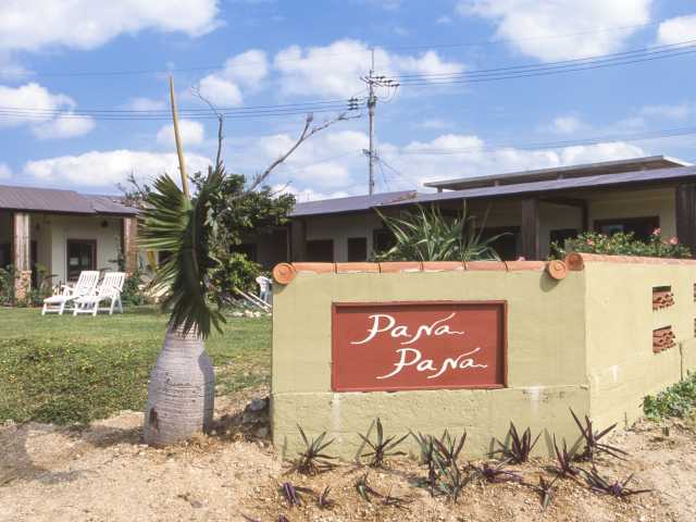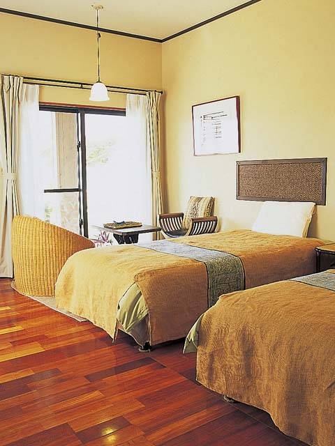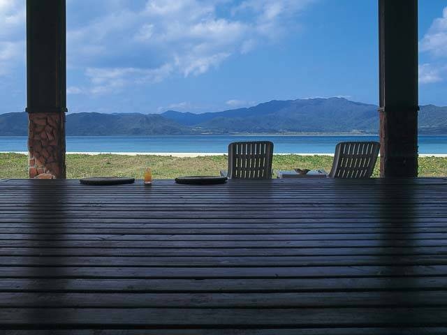 ヨナラ水道に面した宿。12畳2室と20畳1室の客室はそれぞれ仕様が異なる。海に面するテラスもあり、シャワー室も備え、快適に過ごせる。
