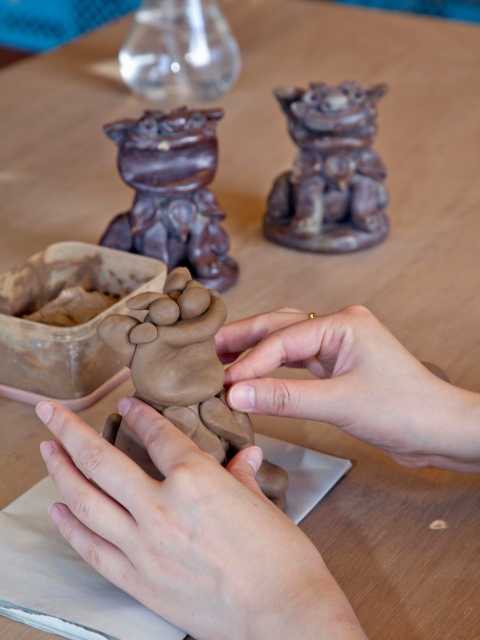 壺屋やちむん通りにある赤瓦屋根の工房で、手びねりやロクロによる作陶体験ができる。シーサーや器など、オリジナルの作品を作ってみよう。予約が望ましい。