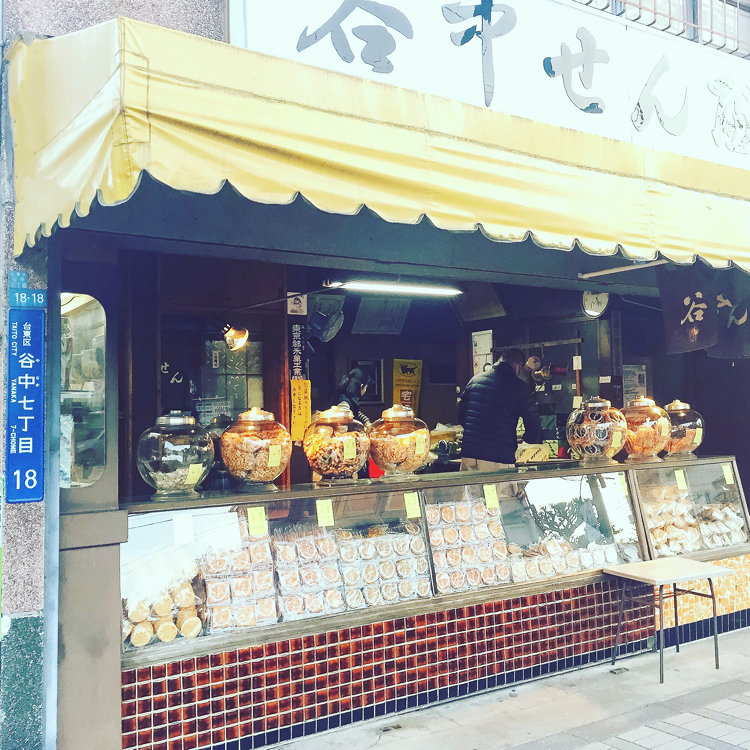 日暮里駅近くのおせんべい屋さん。一番人気はしょうゆ味の堅丸で、ザラメや胡麻、のりなど定番おせんべいがそろう。