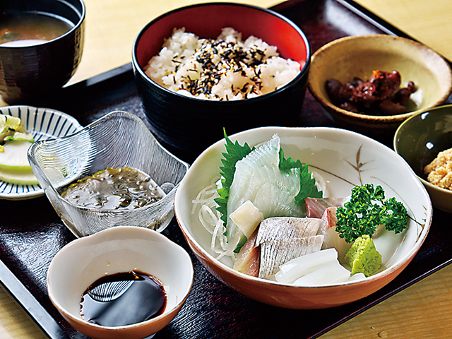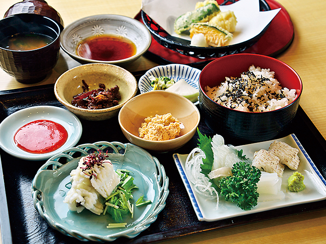 鱧料理で有名な旅館の味が気軽に楽しめる食事処。沼島近海の天然ものの鱧を使った鱧ミニ御膳をはじめ、お造りセットやキス天ぷらセットなど、旬の地魚を中心としたメニューをとり揃える。