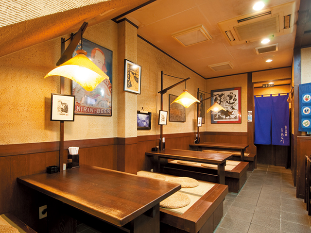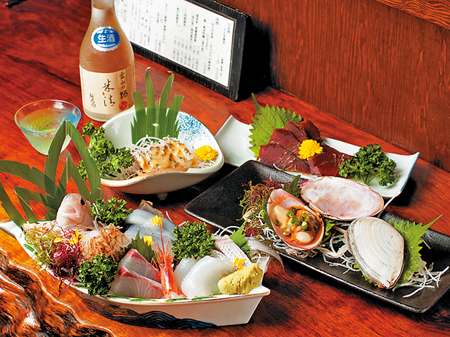 常連客でにぎわう大衆割烹。地元の酒と魚に頑固にこだわり、人気蔵元の富美菊とコラボした自家製の地酒も製造。カウンターには旬の新鮮素材を使った惣菜がずらりと並ぶ。