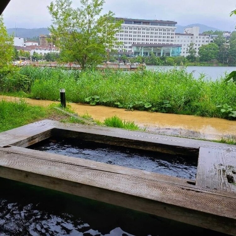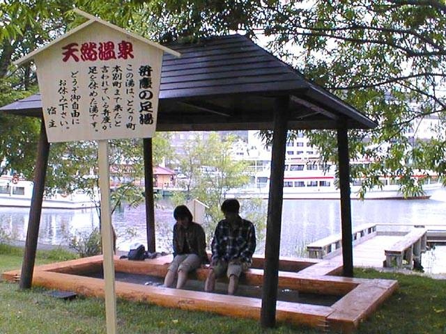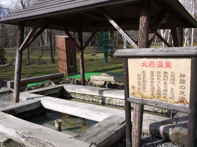 ボッケ遊歩道沿いの湖に面した場所にある足湯。弁慶が足を休めた湯だということからこの名が付けられた。自由に利用可能なので、ゆっくりと旅の疲れを癒そう。