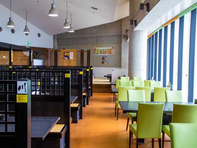 中庭にはかがり火の演出、廊下は畳敷き、ロビーで無料のコーヒー、サウナと水風呂あり。