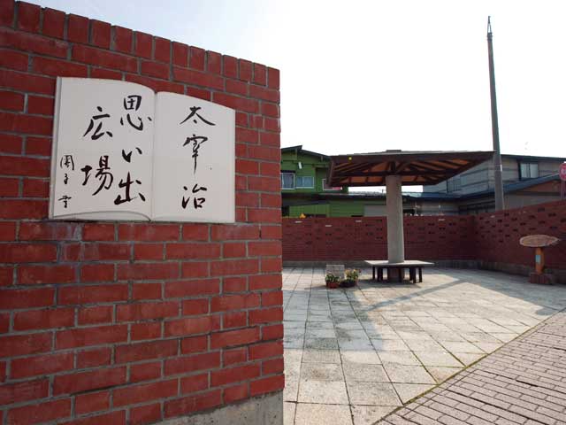 太宰治の母校、金木小学校の通学路にある小さな広場。レンガ壁には太宰の作品名が書かれたプレートが時代順に並ぶ。入口の題字は太宰の長女津島園子氏によるもの。