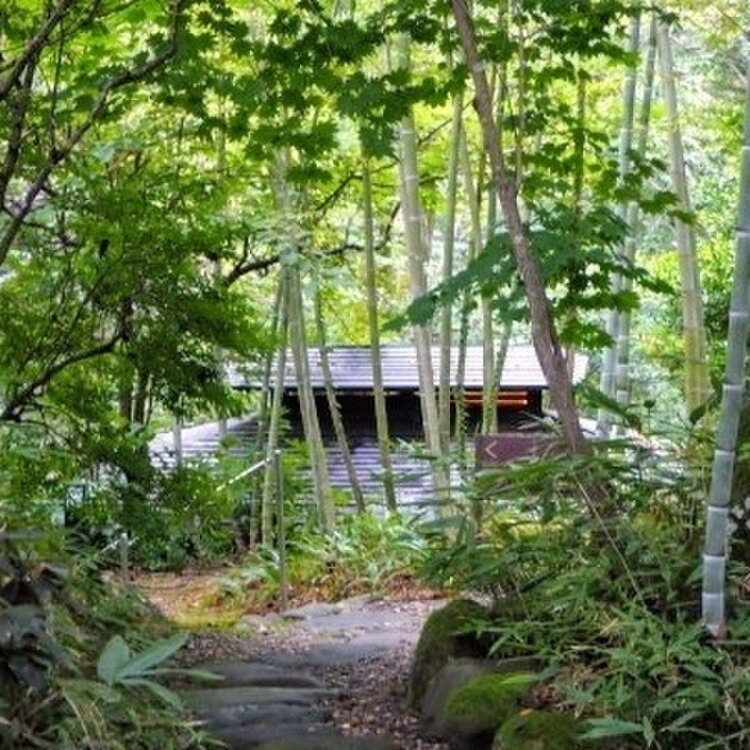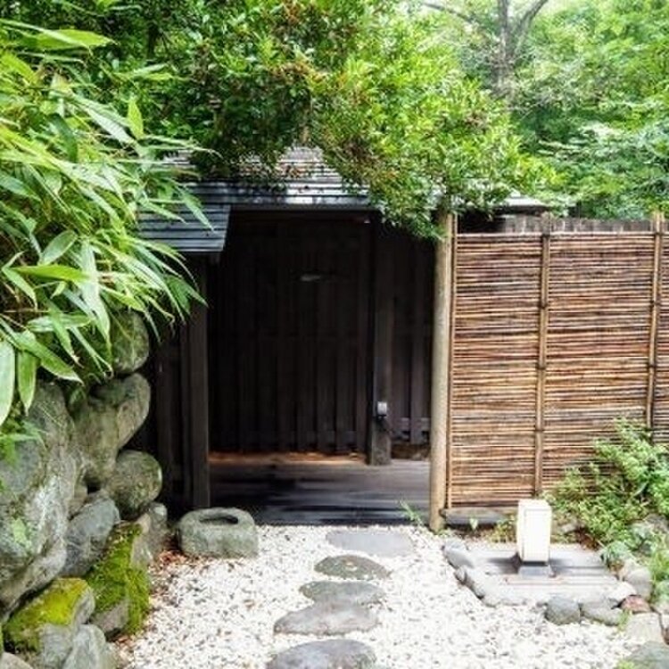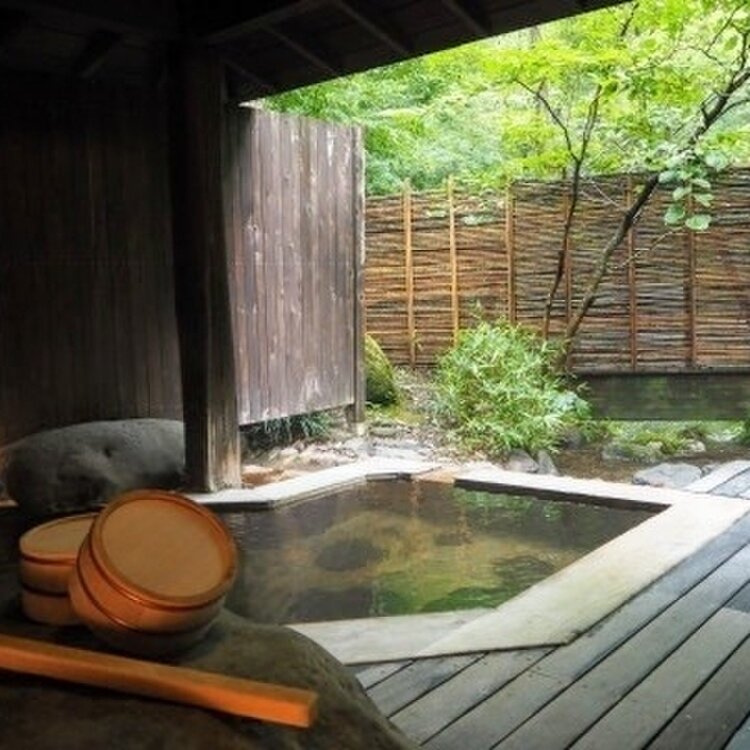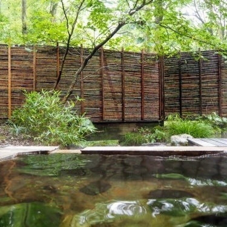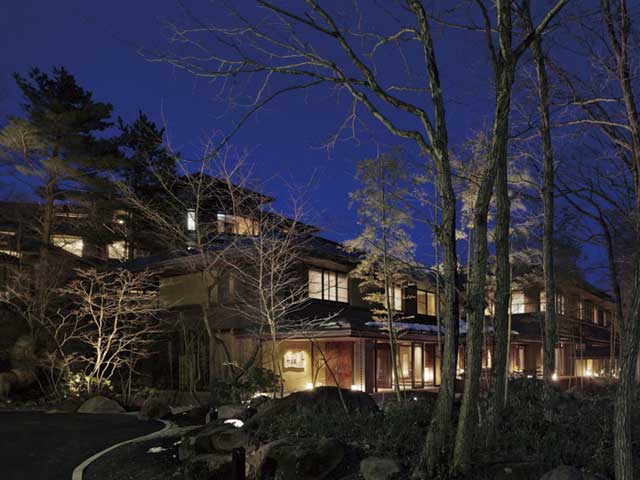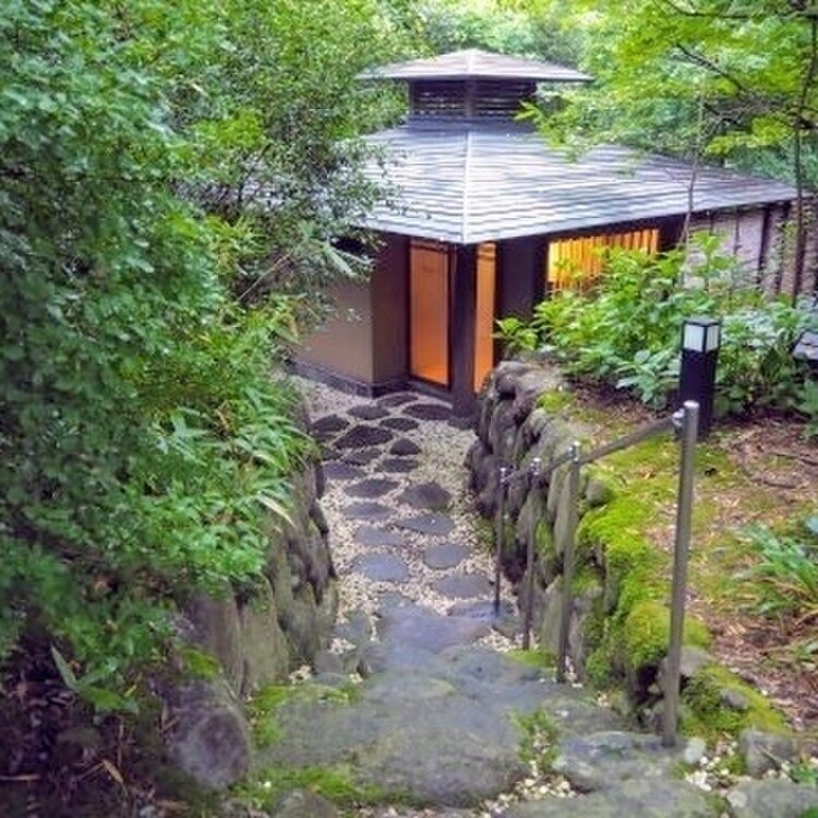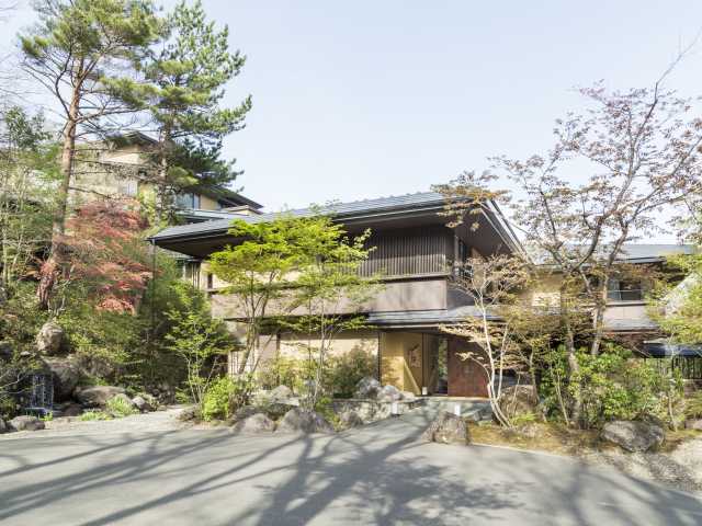 野生のリスや小鳥が訪れる一万坪の森の中に、全室離れの客室と4つの貸切露天風呂が点在する温泉宿。