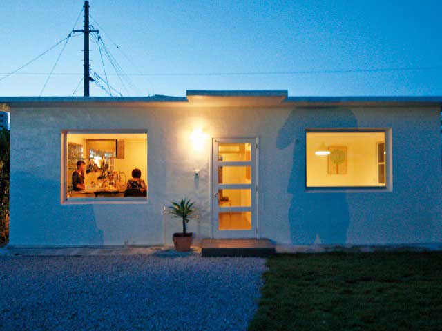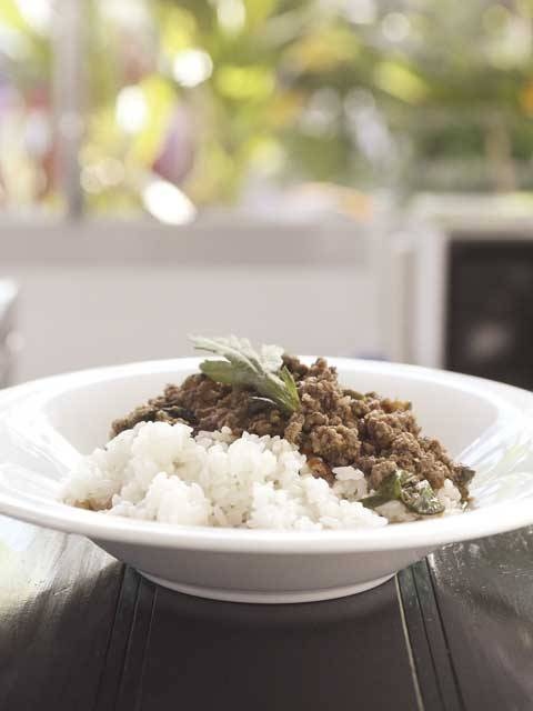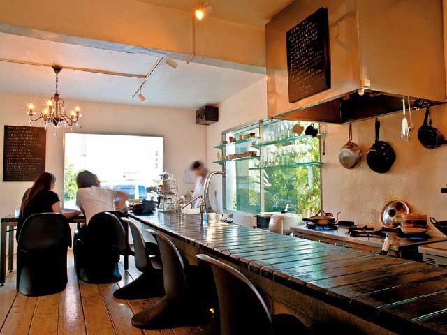 白と黒を基調にしたスタイリッシュなカフェ。県産ヤギ肉を使ったハンバーグやカレーがおすすめ。