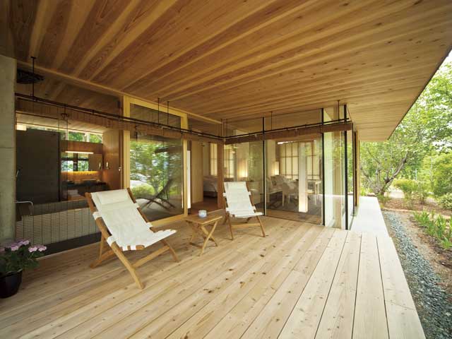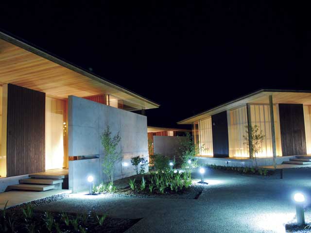 地元産の木材や手漉き和紙を多用し、直線美が映える独特の空間造りが秀逸。客室は離れタイプのヴィラ、和蝋燭が灯るダイニングでは地元の食材を駆使した独創的なフランス料理が供される。