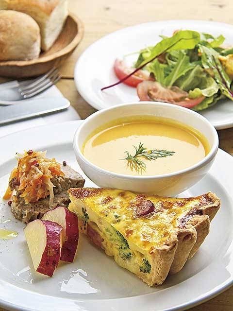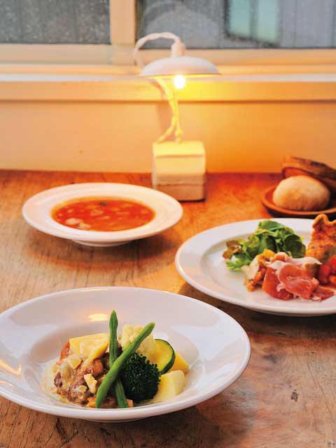 ゆったりと時間が流れるシンプルな店内は、店主がほれ込んだ東京の人気ショップ「アンティークス・タミゼ」がプロデュース。すべて手作りの料理やスイーツにもセンスが光る。