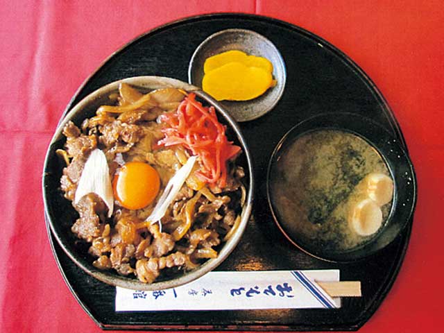 石畳が続く城下町にある喫茶店。おすすめは地元の食材をふんだんに使った牛丼。甘辛い自家製タレで炒めた杵築牛はやわらかく、かむほどにうまみが広がる逸品だ。