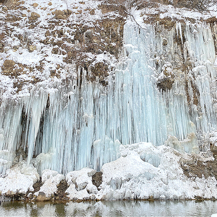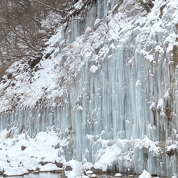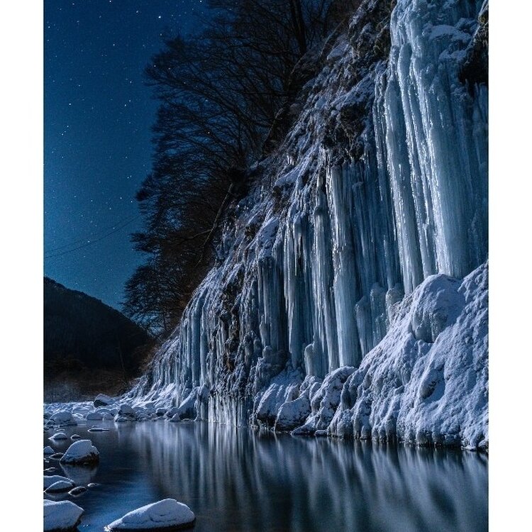 🧊長野県 木曽町 白川氷柱群🌛月も凍る夜 奈良井宿の後に、念の為行きました😊 昼の雪空から夕方には雪が止み。 夜には晴れ間が覗いて来ているようで🙄星写るカナ? 翌日青空の下で…と思っていたけど、とりあえずロケハン兼ねて夜の雰囲気も記録しておこうと⸜( ' ᵕ ' )⸝* 道路沿いの駐車場は分からず、現地の(温泉宿の)駐車場に停めさせていただき河原へ降りると… 岸壁を埋め尽くすような一面の氷柱!!👀 「これ、スゴいよ✨」と驚きつつ数枚撮りました📷 風はなくとも氷点下は指先がしばれますね💦 月明かり🌗しかないし、とりあえず夜が明けてから来よう!と、いそいそと撤退する時に雪の積もった『未舗装の坂道から、舗装の一般道へ出る』少し手前で…それは起こりました😅😅 タイヤが空転しスタック、登れない。 降りてみるとタイヤは道の窪みに、その下は完全な氷⸜( ‎𖦹‎ࡇ𖦹‎ )⸝︎︎ 立ち往生というやつです😱 時間も遅く誰も来ません💧 念の為で持ってきたチェーンもそこでは上手く付かず⛓️ 20-30分試行錯誤し、上には進めないからとりあえずバックしてさっきよりも勢いをつけて何とか登り切ろう!という単純な作戦を決行💦 (車1台の幅の積雪した未舗装坂道って1番ヤバいやつですね😵) 坂道をゆっくり数m下がり… 上手く行かないよな…でも一応!🚙💨 おおっ✨登りきったーーー🤩✨ラッキー🥳🎉 とスリリングなひと時を過ごしたので、今回明るい時間の再訪は無くなりましたꉂꉂ🤣 🔹🔹🔸🔹❀🐦✴ 🔸🔸 ✴🐦❀🔹🔸🔹🔹 【1】【2】南を向いて撮影、月も出ていて空が少し明るい。 【3】北向きの撮影で、月を背にしてます。順光ですね☝ 氷柱の壁と目立った星座を共に収めることはできませんでした〜😅 (2022年2月22日撮影) #長野県 #木曽町 #白川氷柱群 #月光 #雪景色 #つらら #ヒーリング旅 #木曽路 #危機一髪