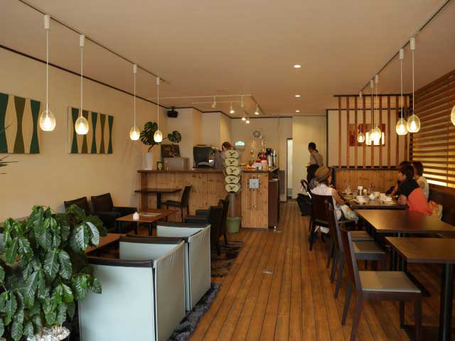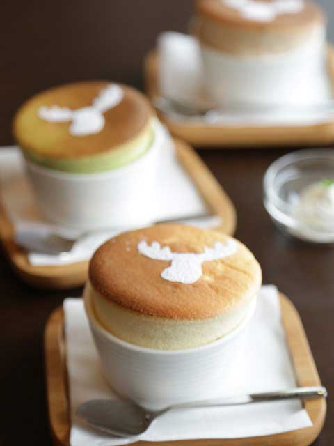 名物はフワフワとした食感が特徴の飯山スフレ。甘すぎない、優しい味わいが人気だ。国産材料にこだわったフードメニューも評判。