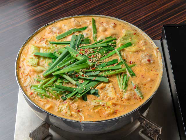 もつ鍋の名店で10年間修業したオーナーが手がける。もつ鍋は醤油、味噌、水炊き風と、辛味噌を使った「田しゅう鍋」の4種類。モツは国産和牛の小腸のみを使う。いちばんおいしいタイミングで味わえるよう、鍋はでき上がった状態で出てくる。