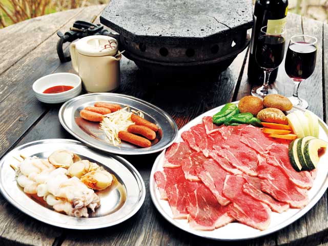 甲府盆地を見下ろすテラス席。屋内もあり雨天や冬期も利用できる。富士山の溶岩石プレートを使って焼く肉はジューシー。