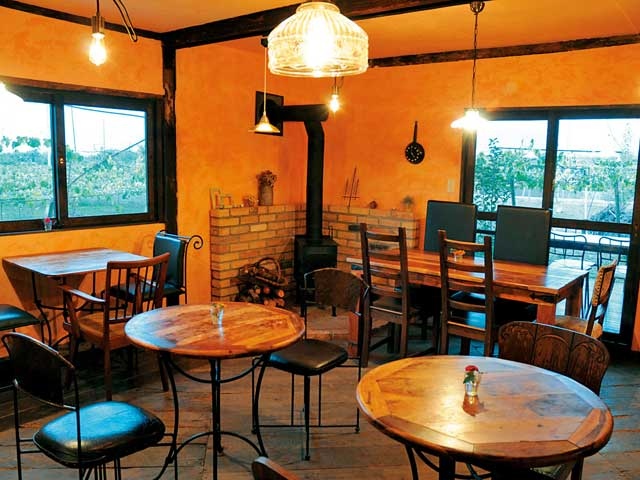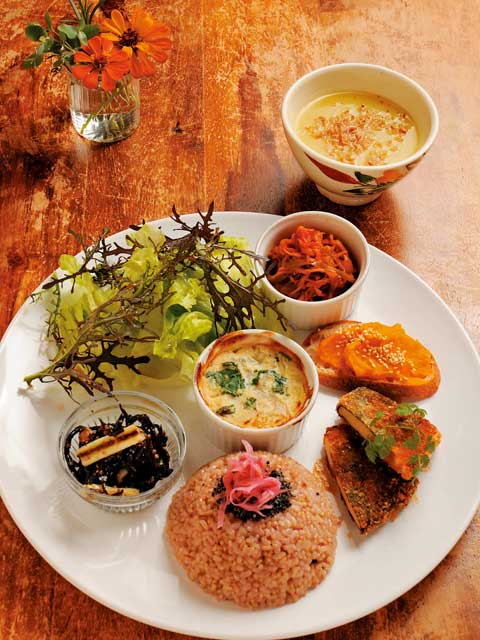 一宮の大北農園内にあるカフェ。自家菜園で育てた健康野菜など、素材のもつ味を堪能できるマクロビオティック料理。玄米ご飯にスープ、おかず5~6品が付くハカリプレートがおすすめ。