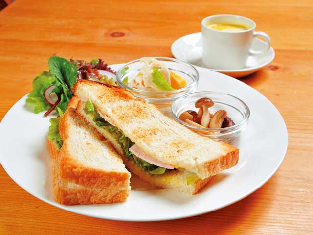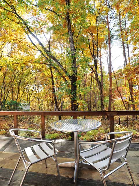 自然に囲まれ、木々の音や鳥のさえずりがBGMのカフェ。別荘地の中を進んだところにある。店の奥にはテラス席があり、自然を眺めながらのランチやカフェタイムが楽しめる。