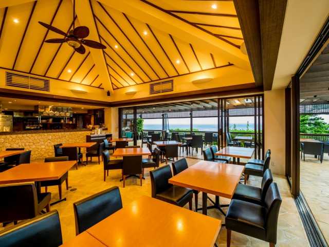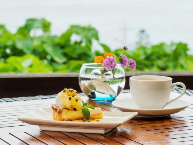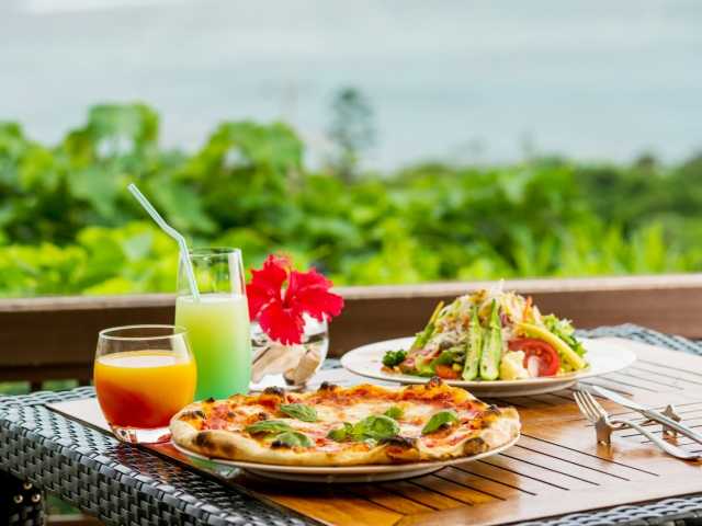 シギララピュタの丘の頂上に建つカフェレストラン。窯で焼くピッツァが自慢で、テラス席からはマリンブルーの海が見渡せる。ランチにスイーツ、ディナーまで多彩なメニューが楽しめる。