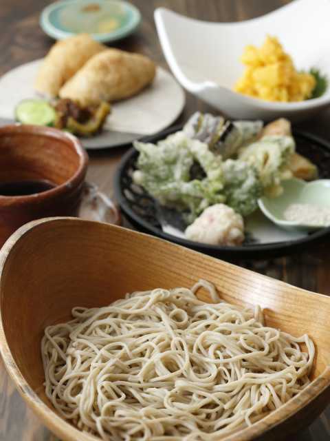 町内の契約農家から仕入れるそばを石臼びきし、地元で名水と評判の秋元神社の御神水を使って手打ちする。コースに付く天ぷらの野菜やいなりずしの米は、いずれも無農薬で自家栽培したもの。女将の児島佐代子さんが集めた信楽焼きなどの器で出す。