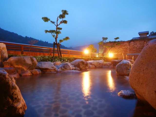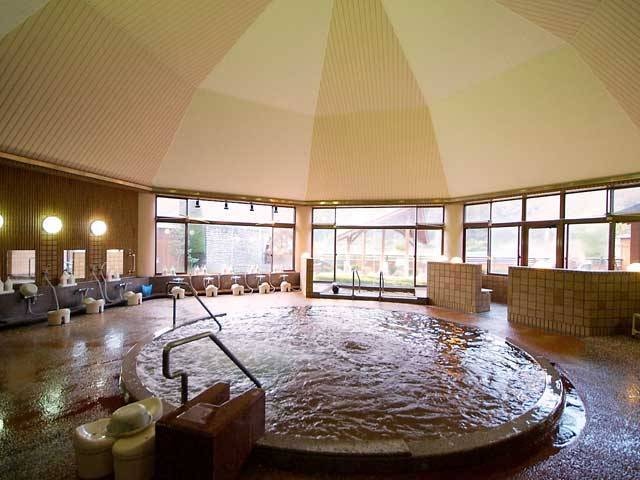 水車のある露天風呂や連なる山並を眺めるサウナなど趣深い浴槽がそろう。源泉は古代花崗岩から湧き出ており、成分は異なるが2種類ともとろりとした重曹泉。宿泊も食事もできる人気の施設。