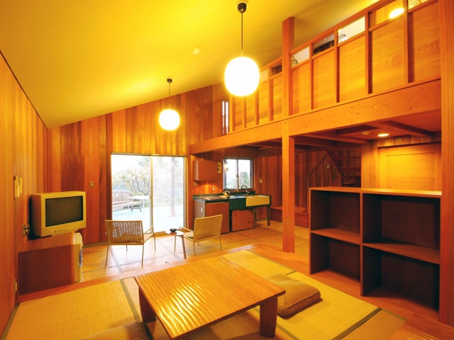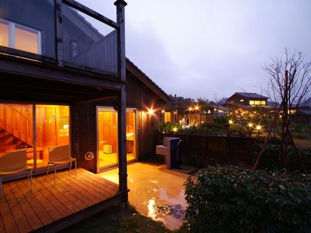 風情ある旅館のような趣を見せる端整な温泉館。浴場は自然木づくしの内湯や竹林を望む優雅な露天風呂など、デザイン性に富んだ個性的な空間。キッチン付きの瀟洒な宿泊ロッジも備えている。