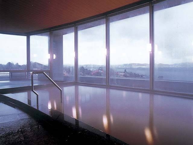 茶褐色の内風呂からは錦江湾と鹿児島市街が一望できる
