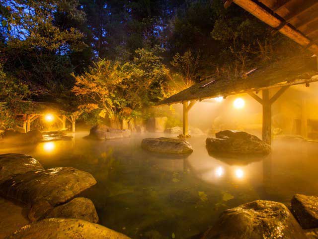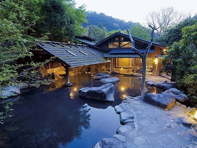 黒川温泉では随一の広さをもつ「仙人風呂」で有名。巨石を置いた開放的な露天風呂で、自然木を植栽した露天風呂と日替わりで男女が入れ替わる。個室休憩食事付入浴の場合、宿泊客専用の貸切風呂や内風呂が利用できる。