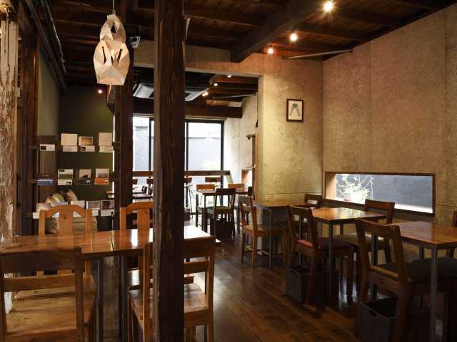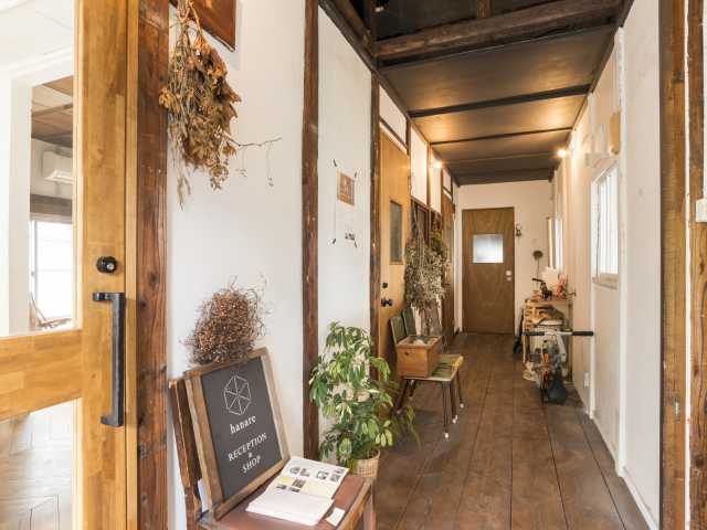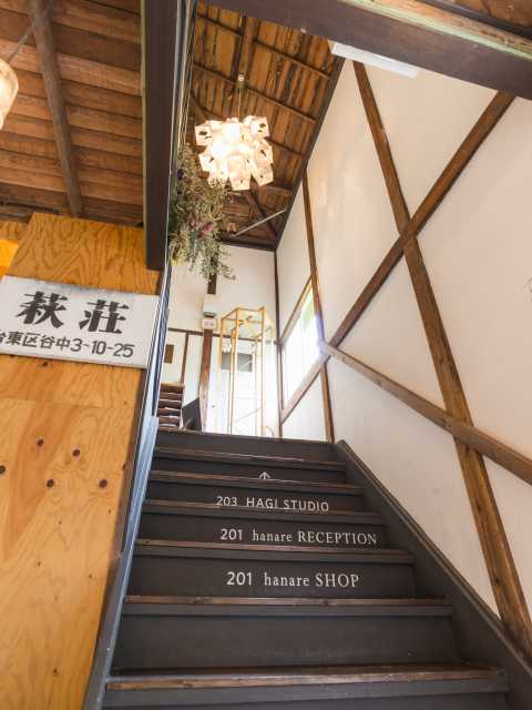 谷中の住宅地にたたずむ木造アパートを改築した複合施設。1階がカフェ(HAGI CAFE)とギャラリー、2階が別棟にあるホテル(hanare)のレセプションと雑貨店。