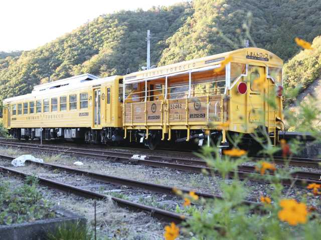 四万十川中流沿いを1日1往復、のんびりと走るトロッコ列車は山吹色の車体が特徴的。蛇行を繰り返す川はもちろん、美しいパノラマ風景も存分に堪能できる。