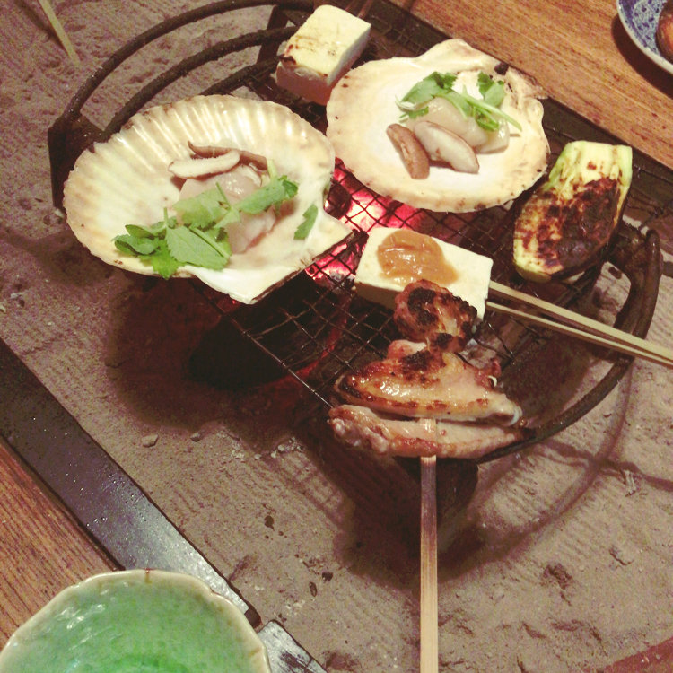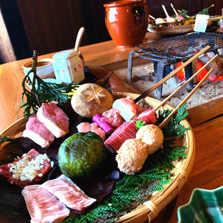 【生石 大松家】 その昔、北前船で栄えた山形県酒田市。 海側へいってしまいがちだけど、今回は、酒田の 長閑な田園の風景を楽しみながら【生石 大松家】へ。 「お母さん、気に入ると思うよ」って、Kおすすめのお店です。 入口の茅葺きの門からして、私の大好き感が漂う。 先に進んで見えた母屋は、築170年という堂々とした旧家。囲炉裏焼きと手打ち蕎麦が自慢の食事処となっています。 ここまでで、すでに大好きに認定! 広い土間や太い梁、ピカピカに磨かれた板の間など、できるだけ手を加えずに大切に使われています。そこが、大松家の魅力なんですね。 案内された個室には、すてに囲炉裏に炭が焚かれておりました。 最初は名物の「季節のへらみそ」が出されます。 この日は、くるみ。 素朴な前菜のあとは、竹ザルに盛り合わせた食材の登場です。牛肉、地鶏、鰰、お野菜etc. 「弁慶めし」は、青菜に包んだ味噌おにぎり。 古くから庄内地方に伝わる郷土料理だそう。 〆の板蕎麦もありがたい。北海道産のキタワセを使った蕎麦は、二八の手打ち。新そはのよいかおり。 ht お料理はもちろん、建物や設えに古き日本が垣間見える【生石 大松家】ファンになりました。 おすすめしたいと投稿しましたが、すでにスポットにことりっぷの記事が。 そちらも是非ご覧ください。