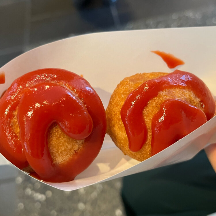 ー◯◯ 仙台名物『ひょうたん揚げ』 今日のおやつに食べました 久しぶりに食べたけどやっぱり 美味しい〰️(っ ॑~ ॑c)♡ 値上がりして今は一本300円😆 * ひょうたん揚げとは まあるいボール状の蒸しかまぼこをほんのり甘い衣で包んで揚げたアメリカンドック風のスナックなんですよ〜❤️ ふたつ繋がって ひょうたんの形です😊 揚げたて衣のサクサク食感がたまりません(⑉• •⑉) 🌀🌀ぐるぐるのケチャップが可愛いでしょう 🎯当たりが出たらもう一本貰えます👏 * 写真1〜3枚目 📷映えるフォトスポットありますよ😊 今回は白い笹かまぼこの前でパシャリ! Σpω・´) 金ピカのひょうたん・白い笹かま どちらがお好みですかꉂ🤭 * 写真4枚目 お店の向かって右手がひょうたん揚げのテイクアウトコーナー。座って食べられるベンチがあるのでご利用くださいね𐀦𐃄 下の写真は昨年の阿部蒲鉾店竹飾り🎋いつも美しくて必見です✨️ 写真5枚目は 先日の青葉まつり 阿部蒲鉾店さんの山車に搭乗された 恵比寿さまです🙏❤️ * #ひょうたん揚げ で🔍⸒⸒けんさく〜ぅ たくさんのことりっぷユーザーさんが召し上がっていらっしゃいます🤗 仙台の食べ歩きにおすすめです👍 * #ことりっぷ仙台 #仙台 #わたしの街 #食べ歩き #ひょうたん揚げ #阿部蒲鉾店 #かまぼこ #仙台名物 #阿部かまぼこ #毎日おやつ #幸せおやつ #カメラ #fumitubu #ふみつぶ〜ぬ #テイクアウト #そうだ宮城に居よう。