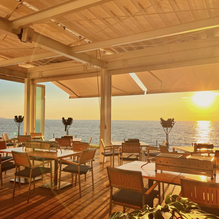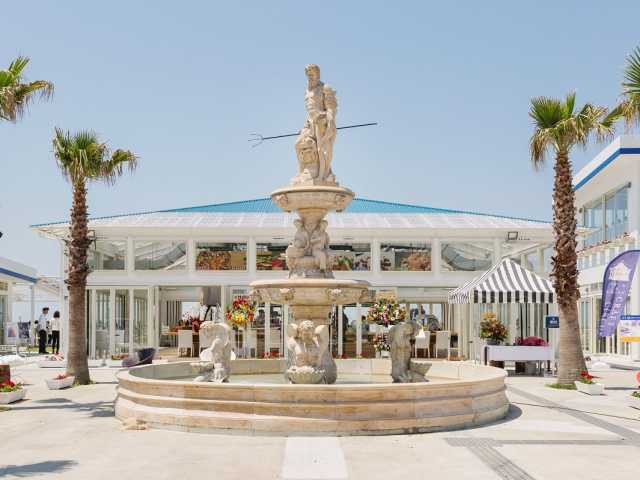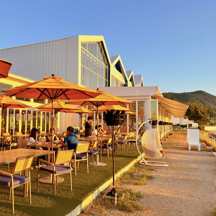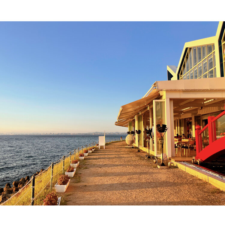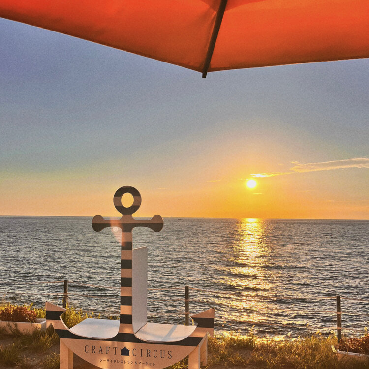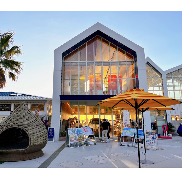 ビーチサイドのレストランとにぎやかなクラフトマーケット