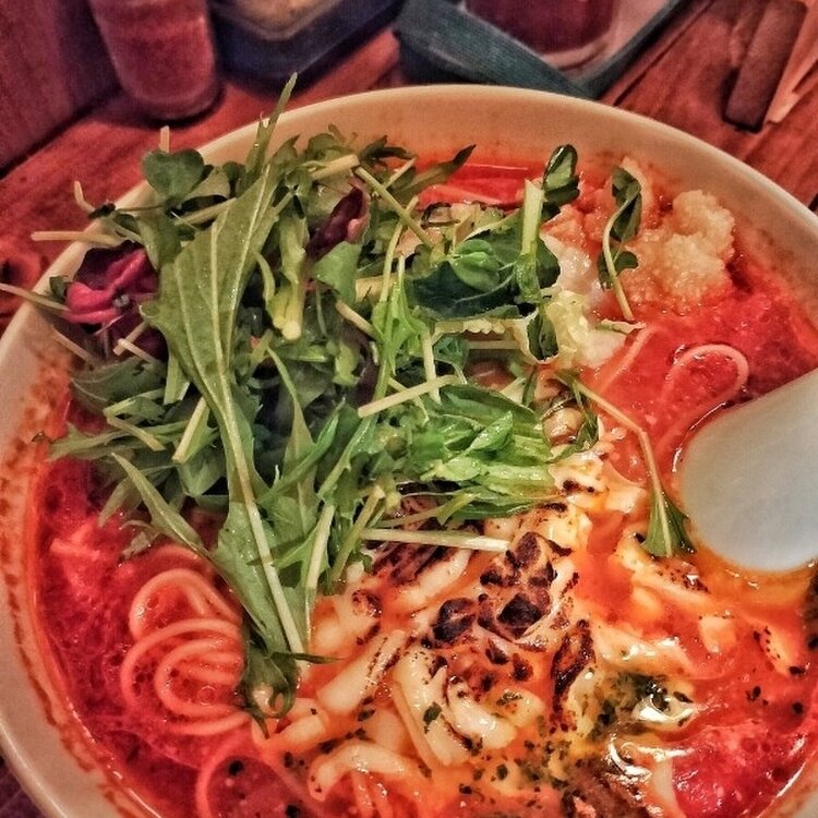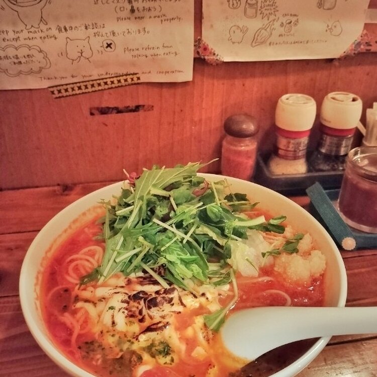 中目黒【トロケの台所】 こじんまりとした定食屋さん! トマトラーメンが有名だそうで、トマトラーメン好きだから寄ってみました🍅 メニュー沢山あるのでどれが良いかわからず、、 普通のトマトラーメンに、焼きチーズとガーリックトッピングにしました! トマト濃厚でとっても美味しい~(*´ч`*)❤️ トマトの実もトロトロごろっと入ってました😍 シャキシャキ野菜は水菜が中心だったと思うけど、パクチーもあったらいいなぁ😋 アツアツなのでチーズが固まらず最後まで麺に絡んでスープも平らげちゃった(◍•ڡ•◍)❤ 太陽のトマト麺の店舗が減ってしまってトマトラーメンを食べる機会がなかったのでここはまた行こう♪ 定食もきになる⸜(* 'ᵕ' *)⸝ 1人でも入りやすい!というか、コロナの影響か、1~2人推奨とお店側が謳ってます🗒💭 最近行ったお店でおすすめしたいのが幾つかあるけど、3店連続、店内が暗くて写真がちゃんと撮れず(笑)これもそのうちの一つだけどまだ見える方なので投稿! 目黒川の桜は2分咲きくらいかな? 週末寒いので春分の日以降が見頃になりそう🌸 提灯も準備されてて4年振りのライトアップにワクワクしました✨ #中目黒グルメ #トマトラーメン #トロケの台所 #中目黒 #目黒川