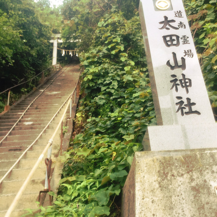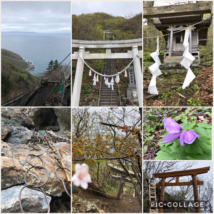 ☆函館里帰り編➈ 『日本一参拝が困難な神社』 と言われている太田山神社⛩道南五大霊場、の1つのパワースポットです。 300年以上前から信仰されていて、猿田彦大神が祀られています。もともとは女人禁制の山岳信仰で、今では登山の安全祈願に来る方も…✨ 今回のメインでぜひ行きたかった神社。夫と子供は近くの温泉を満喫している間にサクッと登ろうと…。 昨年、荒天で諦め、今回は必ず登ろうと決めてました⭐️今回も天気はあまり良くなく、雨が来ない内に降りてこようと、なかなかのペースで登りました🙂 さすがはパワースポットです!序盤の壁の様な階段でパワーが必要です✨この階段で諦める人もかなりいると思うくらいの勾配・幅の狭い小石で滑る階段…。登り切り下を見るとヒヤヒヤとしてスリル満点💯 あとは険しく、急登の参道を(山道)ロープやハシゴを頼りにひたすら登りました。途中女人堂でお参りして、やや、登ると雨が降り始めましたが、不思議と降りようとは思わず進み、ラスト、噂の北尋坊の崖とそこに掛かる鉄橋が見えてきました。 この鉄橋が本殿の洞窟の真下にある足場で、一歩進むたびに沈み、雨で滑る事この上ないのです。やっとの思いで、本殿の真下に来ましたが、この7メートルの垂直かつ、突き出した崖を登る鉄の鎖が固定してないので揺れるのと雨でやはり滑るのです🍬 落ちたら間違いなく怪我では済まず、まだ、召されたくないので、本殿の屋根を眺めて、お参りしました。 不思議とお願い事などはでてこなくて、全く不思議な気持ちになる神社でした。 只々、ここまで来れたのと、無事に生かされてることへの感謝だけをお伝えして降りました。 次は好天の時に必ず本殿の前でお参り出来ればいいなぁと思います☺️ もし登られる方は登山の装備がいいと思います✨ マムシ・ヒグマ対策もお忘れなく😃そして、危ないなと思う日は絶対に無理しないで下さいね⭐️