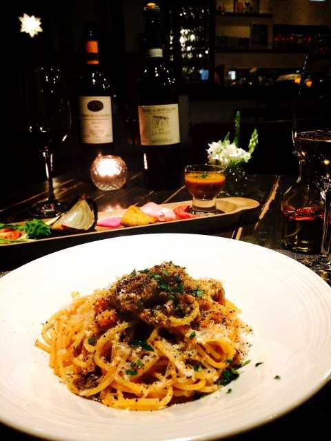 イタリアでワインや料理の修業をしたシェフがお届けする料理や空間。壁際にはたくさんの本があり、ひとりでも大人数でもゆったりとした時間が過ごせる。